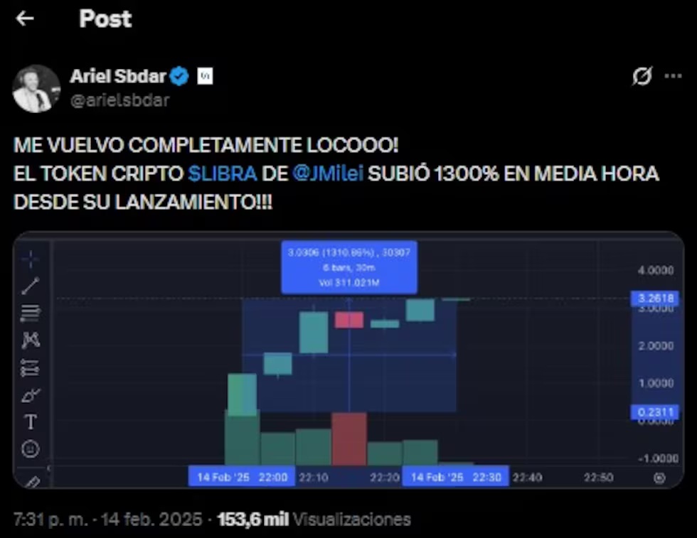 Antes de eso, Sbdar había publicado mensajes en los que destacaba que el “token cripto $LIBRA de Milei” había subido 1300 por ciento en media hora, lo comparó con hacer trading (compraventa especulativa de activos financieros) con bonos del tesoro nacional, entre otras cosas como decir: “Acabamos de resolver el problema de la deuda externa argentina señores, todo en orden” o “Nunca soñé estar vivo mientras mi Presidente largaba una meme coin!!!”.