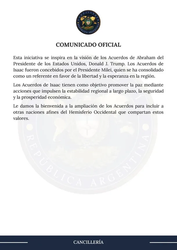 El documento oficial subraya que los Acuerdos de Isaac se inspiran en la visión de los Acuerdos de Abraham impulsados por Donald Trump. En este sentido, Cancillería destaca a Milei como el artífice de esta iniciativa, posicionándolo como un referente regional en la promoción de la estabilidad y la prosperidad económica a largo plazo.