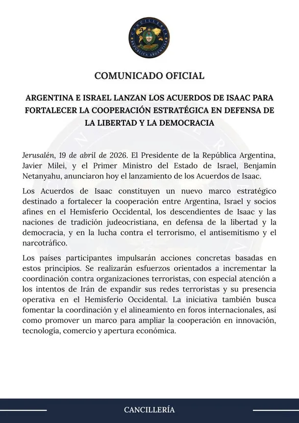 A través de un comunicado de Cancillería, el Gobierno argentino oficializó este domingo el lanzamiento de los “Acuerdos de Isaac”, un entendimiento alcanzado entre el presidente Javier Milei y el primer ministro israelí Benjamin Netanyahu.