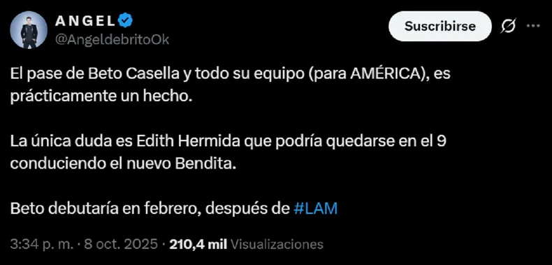 A través de su cuenta de X, el periodista Ángel De Brito se encargó de revelar la noticia: «El pase de Beto Casella y todo su equipo (para América), es prácticamente un hecho». Al tener en cuenta que él trabaja al frente de LAM, programa de chimentos de este canal, es evidente que la información es de primera mano.