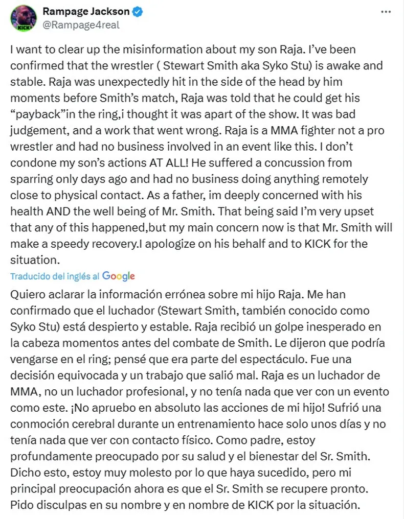 De igual modo, se mostró en contra de la actitud de Raja y se solidarizó con Syko Stu: “¡No apruebo en absoluto las acciones de mi hijo! Como padre, estoy profundamente preocupado por su salud y el bienestar del Sr. Smith. Dicho esto, estoy muy molesto por lo que haya sucedido, pero mi principal preocupación ahora es que el Sr. Smith se recupere pronto. Pido disculpas en su nombre y en nombre de KICK por la situación”, agregó.