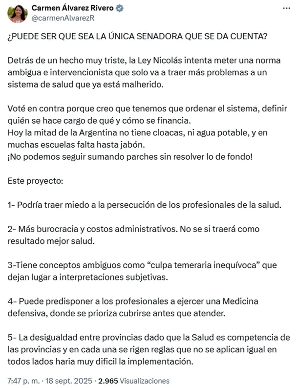 Mediante una publicación en redes sociales titulada “¿Puede ser que sea la única senadora que se da cuenta?”, Carmen Álvarez Rivero trató de argumentar su voto contra la “Ley Nicolás”, calificando la norma como “ambigua e intervencionista”.