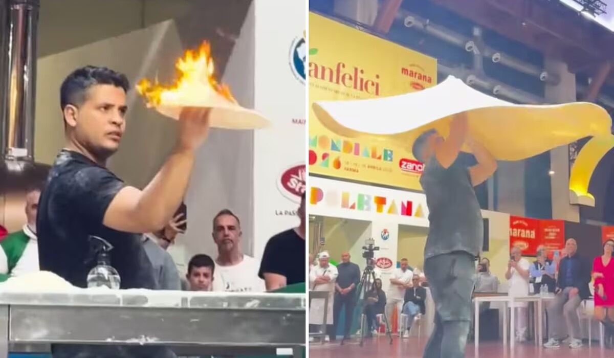 La rutina de Ortigoza en Parma fue una performance cargada de destreza, riesgo y creatividad que cautivó tanto a los jueces como al público presente. Entre los momentos más impactantes de su exhibición, el pizzero incorporó acrobacias con fuego y un cierre magistral: el giro de una masa de más de seis kilos con una circunferencia que superó el metro y medio de diámetro sobre su propia cabeza.