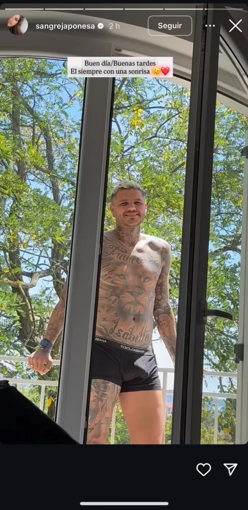 Icardi se deja grabar y se muestra sonriente, pese a la exposición. Suárez hizo un plano completo y acompañó las imágenes con un texto: “Buen día / buenas tardes. Él siempre con una sonrisa”.