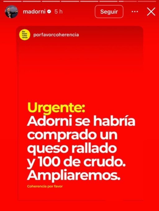 En ese contexto, el Jefe de Gabinete sólo se expresa a través de las redes sociales y este jueves decidió subir una historia burlandose de las acusaciones de corrupción: «Adorni se habría comprado un queso rallado y 100 de crudo» decía el texto compartido de la página Coherencia Por Favor.