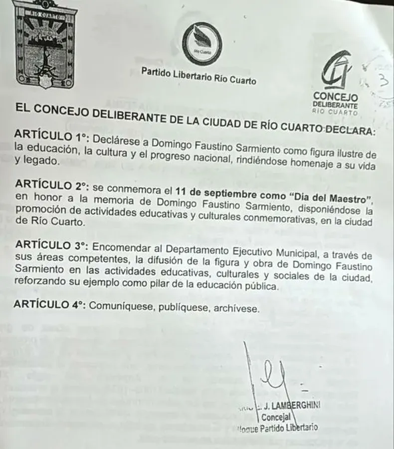 La iniciativa fue elevada por el concejal Lamberghini, referente del Partido Libertario en Río Cuarto, Córdoba, quien firmó el proyecto con la curiosa iniciativa con el fin de «difundir la figura y obra de Domingo Faustino Sarmiento».