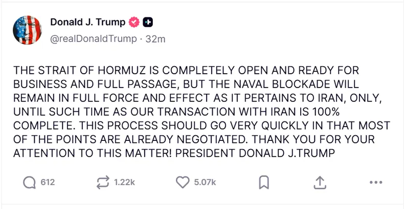 Luego escribió un nuevo posteo en el que completó: “El estrecho de Ormuz está completamente abierto y listo para operar con tránsito pleno, pero el bloqueo naval seguirá en plena vigencia en lo que respecta únicamente a Irán, hasta que nuestra negociación con ese país esté completada al 100%».