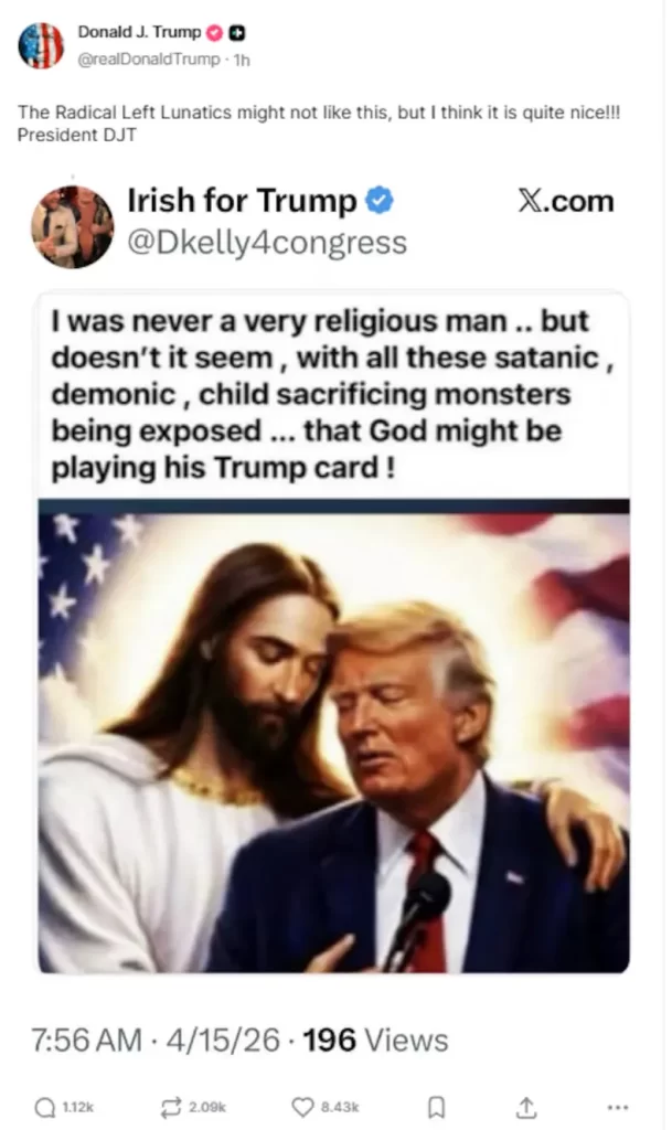 Además, Trump subió otra imagen en la que aparecía abrazado con Jesús delante de una bandera norteamericana, que luego borró. «Puede que a los lunáticos de la izquierda radical no les guste, pero creo que es bastante linda», escribió. Sus publicaciones con referencias religiosas provocaron críticas incluso dentro de sectores conservadores, que consideraron esas representaciones como blasfemas.