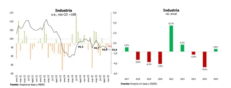 El empleo industrial refleja esa dinámica. De acuerdo con el relevamiento basado en datos del SIPA, el sector perdió 36.116 puestos registrados en un año, una caída del 3,1% interanual, mientras que respecto al pico de actividad de agosto de 2023 la pérdida asciende a 64.167 empleos (-5,4%).