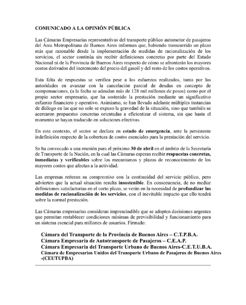 «Las Cámaras empresarias consideran imprescindible que se adopten decisiones urgentes que permitan restablecer condiciones mínimas de previsibilidad y funcionamiento para un sistema esencial para millones de usuarios», concluyeron.
