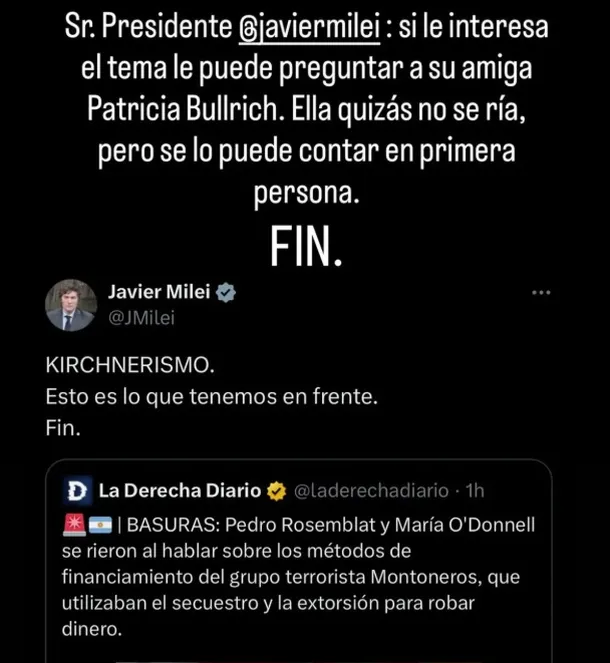 Lejos de esquivar la polémica, Rosemblat optó por responder públicamente. Y lo hizo con un mensaje corto, cargado de ironía y con una clara intención de contraatacar. “Presidente, si le interesa el tema, le puede preguntar a su amiga Patricia Bullrich”, escribió, en alusión directa a la ministra de Seguridad.