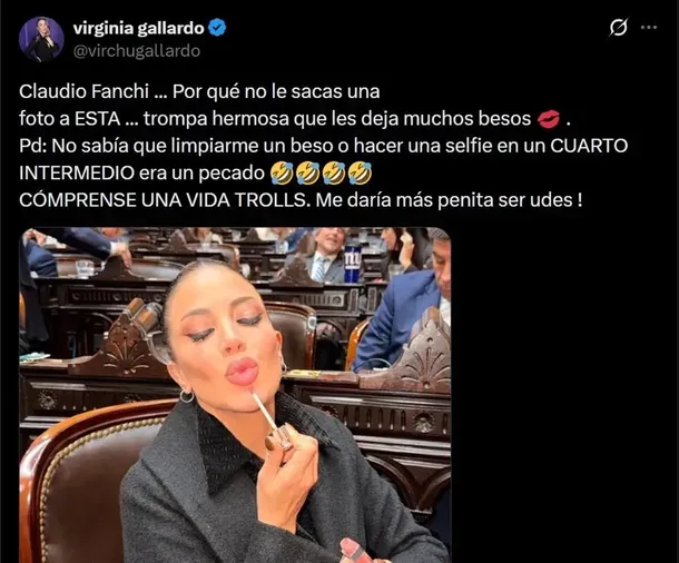 Y sumó: “No sabía que limpiarme un beso o hacer una selfie en un cuarto intermedio era un pecado. Comprénse una vida trolls. Me daría más penita ser ustedes”.