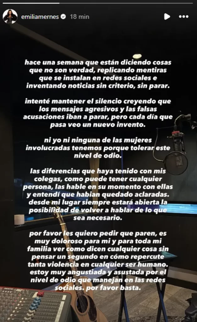 Y, como si fuera poco, otras artistas también dejaron de seguirla, y a esto se sumaron los fandoms y los cientos de comentarios en contra de la cantante. Por esa razón, Emilia se vio empujada a romper el silencio y pedir que dejen de hostigarla e inventar situaciones alrededor de su figura que no son ciertas.
