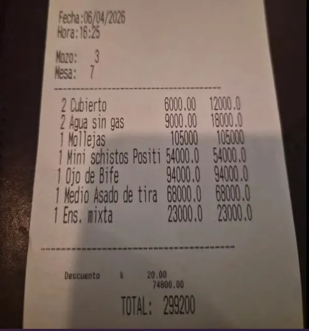 Ticket viral: comieron en una parrilla, les hicieron 20% de descuento y pagaron $299.200