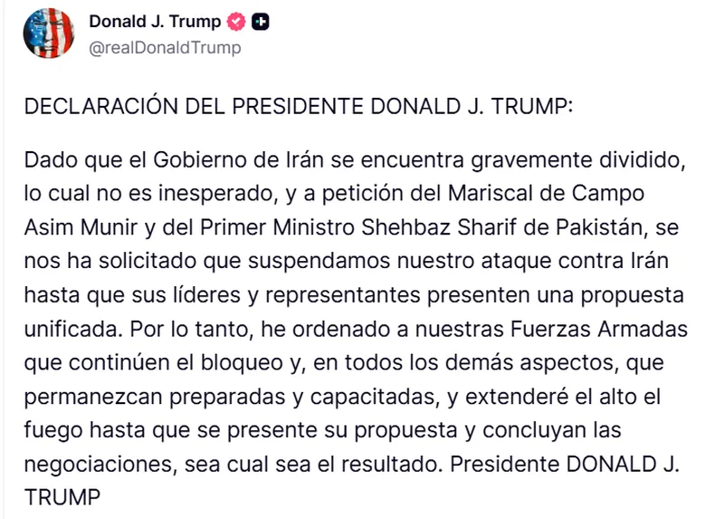 A través de sus redes sociales, el líder republicano detalló la situación interna del país rival: «Dado que el Gobierno de Irán se encuentra gravemente dividido, lo cual no es inesperado… extenderé el alto el fuego hasta que se presente su propuesta y concluyan las negociaciones, sea cual sea el resultado».