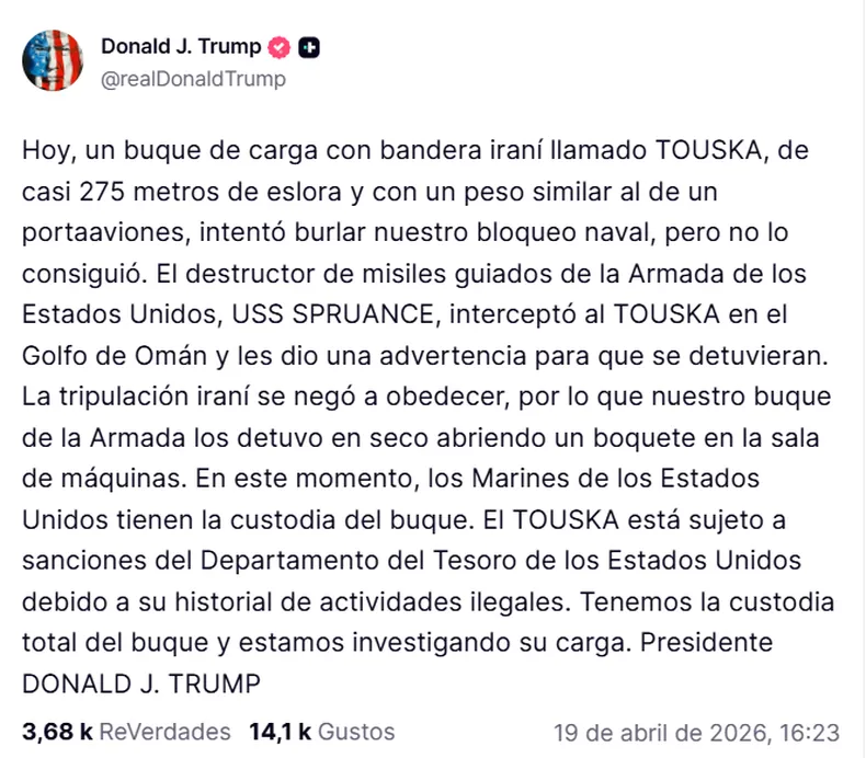 «Nuestra nave de la Marina interceptó al TOUSKA en el Golfo de Omán y le dio una advertencia para que se detuvieran. La tripulación iraní se negó a obedecer, por lo que nuestro buque de la Armada los detuvo en seco abriendo un agujero en la sala de máquinas», detalló Trump este domingo en Truth Social.